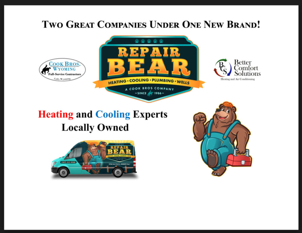 We are excited to announce the launch of our new Brand – Repair Bear Heating and Cooling in the Cody, Powell and surrounding areas of Wyoming. The merger of Cook Bros. Wyoming with Better Comfort Solutions, LLC (BCS) has created a force in the local HVAC provider in our market. Larry Waldron, former owner of BCS, is heading up the HVAC divisions of both Cook Bros Wyoming and Repair Bear Heating and Cooling, bringing his 21 years of hands on field tech and installer experience to Repair Bear Heating and Cooling. Cook Bros. Wyoming acquired Better Comfort Solutions, LLC in the Spring of 2025, and Larry was the most valuable “asset” in the transaction. We are poised, together, to quickly become the dominant Heating and Cooling service and installation provider in our local, Cody, Powell and surrounding areas of Wyoming.